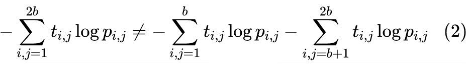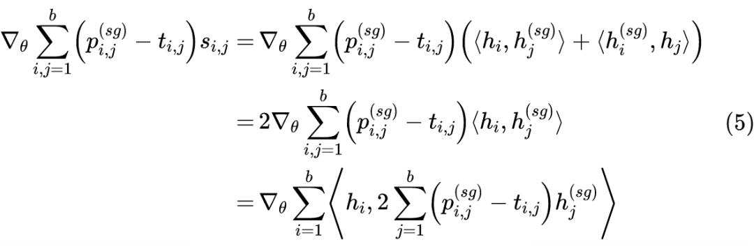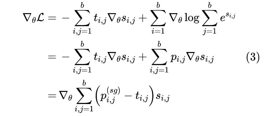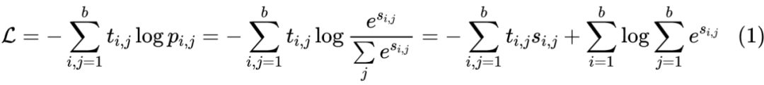 这里的 b 是 batch_size; 是事先给定的标签,满足 ,它是一个 one hot 矩阵,每一列只有一个 1,其余都为0;而 是样本 i 和样本 j 的相似度,满足 ,一般情况下还有个温度参数,这里假设温度参数已经整合到 中,从而简化记号。模型参数存在于 中,假设为 。