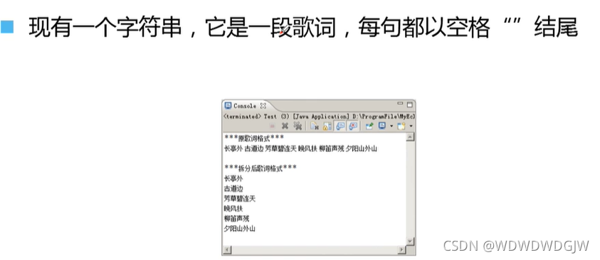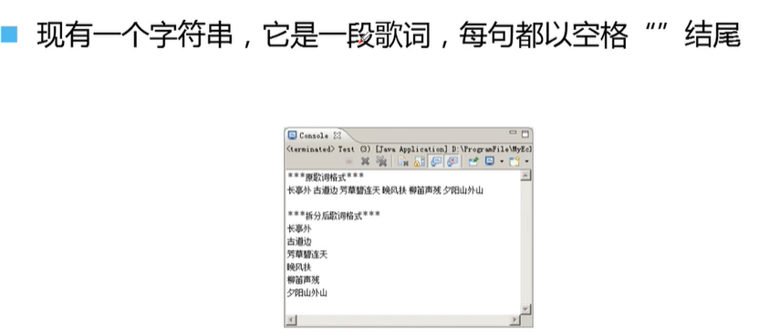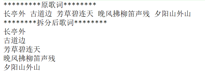public class StrMethods {public static void main(String[] args) {System.out.println("*********原歌词********");String song="长亭外 古道边 芳草碧连天 晚风拂柳笛声残 夕阳山外山";System.out.println(song);//把字符串拆分-->String[]String[] songs=song.split(" ");//引号里是一个空格System.out.println("********拆分后歌词********");for (String s:songs){System.out.println(s);}}