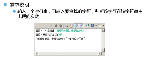 public class Counter {//查找某个特定字符串在整个字符串中出现的次数public int counter(String info,String find){int count=0;String[] chars=new String[info.length()];//字符串转换为数组元素for (int i = 0; i < chars.length; i++) {chars[i]=info.substring(i,i+1);//把字符串info中i位置的字符串依次取出,放入字符串数组chars中if (chars[i].equals(find)){count++;}}return count;}public static void main(String[] args) {Scanner input=new Scanner(System.in);System.out.println("请输入一个字符串:");String info=input.next();System.out.println("请输入您要查找的字符:");String find=input.next();Counter c=new Counter();int count=c.counter(info,find);System.out.println("\""+info+"\""+"中包含了"+count+"个"+"\""+find+"\"");}