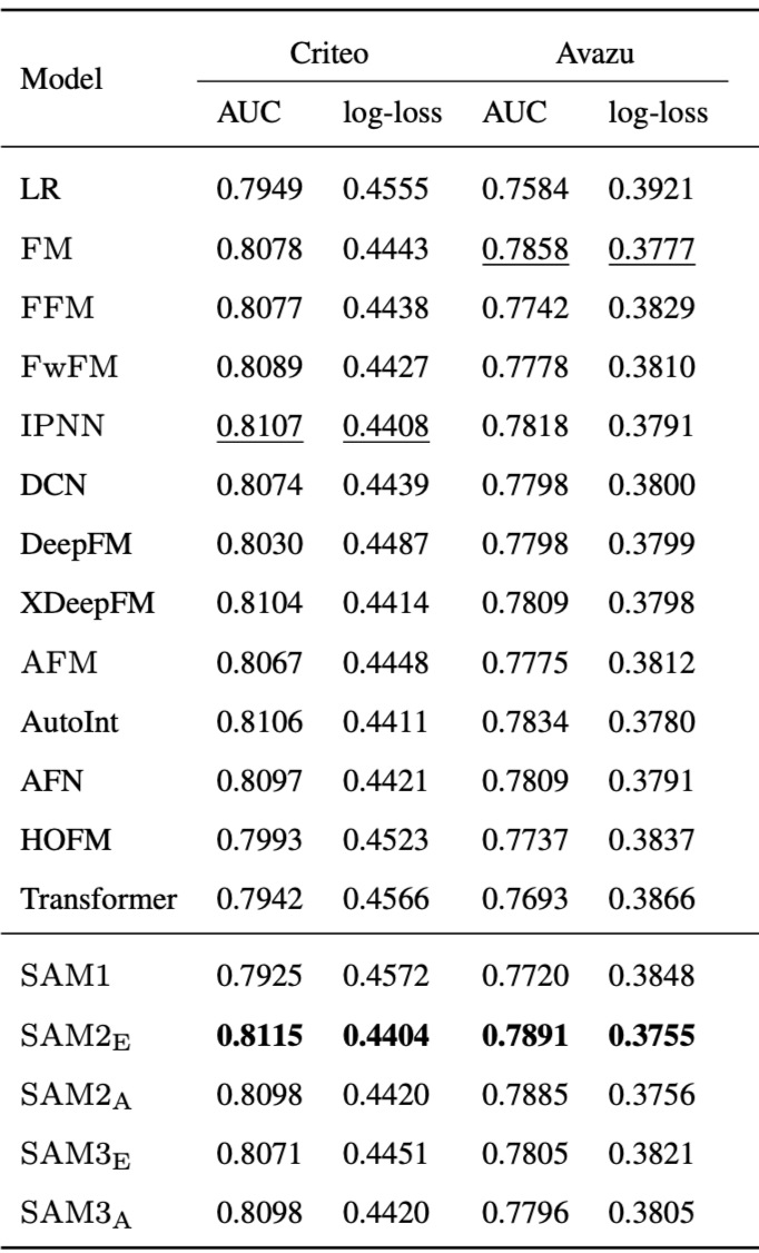 此外,作者基于本文的框架扩展了现有的 CTR 模型,并提出了三种类型的 SAM,其中 SAM1 和 SAM2 模型分别是 LR 和 FM 模型的扩展,SAM3 对应于 Transformer 中的 self-attention 模型与原始模型-场嵌入扩展到成对场嵌入。根据在两个数据集上的实验结果,虽然本文的扩展可以获得相当有竞争力的结果,但 SAM3 模型并没有表现出其显着的优势。