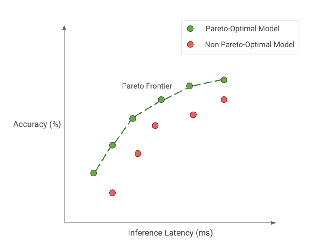 无论优化目标是什么,我们都希望实现帕累托最优。这意味着我们选择的任何模型都是我们关心的权衡的最佳选择。如图,绿点代表帕累托最优模型,其中其他模型(红点)在相同的推理延迟下均无法获得更好的准确性,反之亦然。帕累托最优模型(绿点)共同构成了我们的帕累托前沿(pareto-frontier)。根据定义,帕累托前沿中的模型比其他模型更有效,因为它们在给定的权衡下表现最好。因此,当我们寻求效率时,我们应该考虑在帕累托前沿上发现和改进。