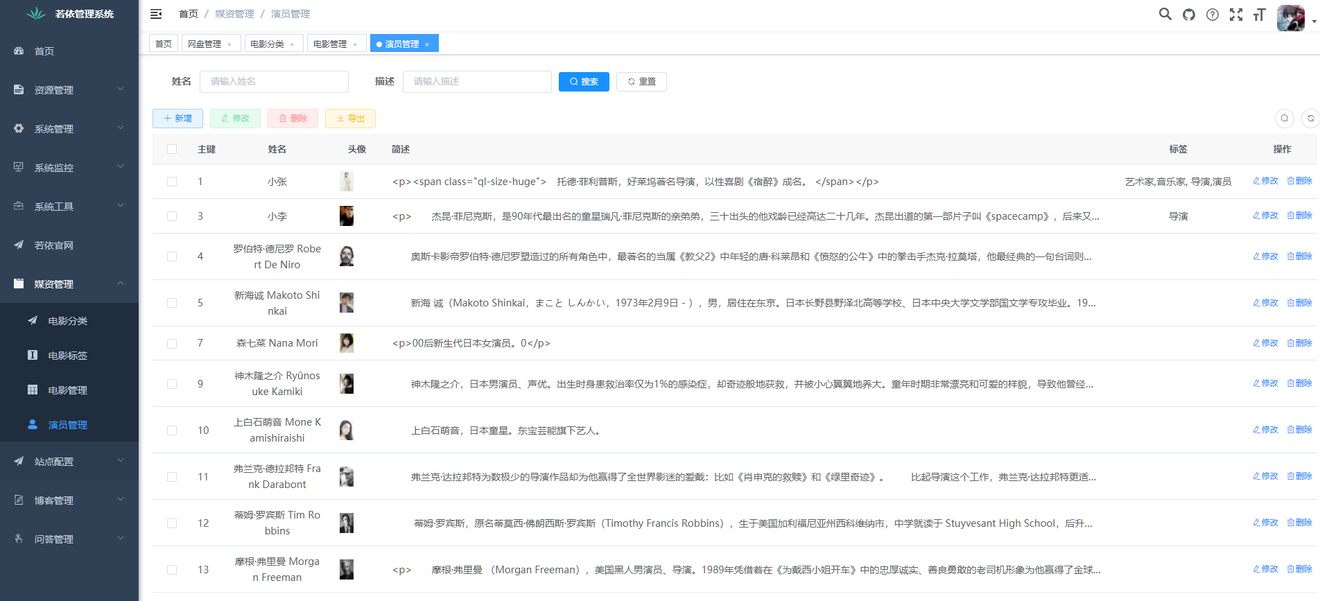 - 后台管理系统模块增加了资源管理模块、媒资管理模块、站点配置模块、博客模块、问答模块;