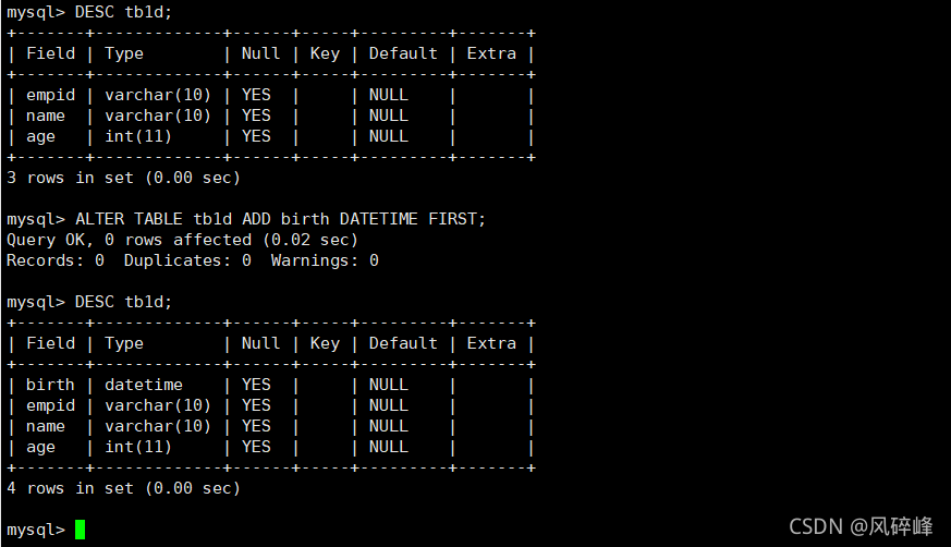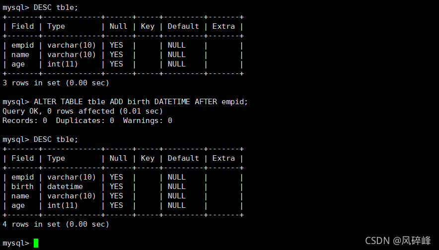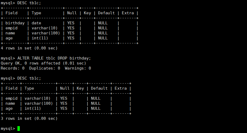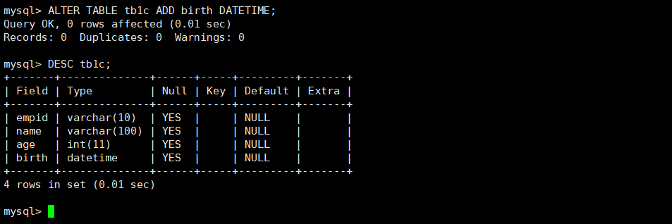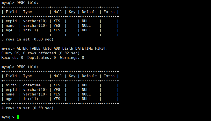 例如,将列birth添加到表tb1e的列empid的后面。