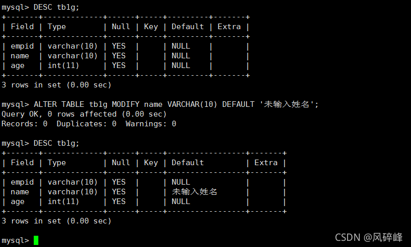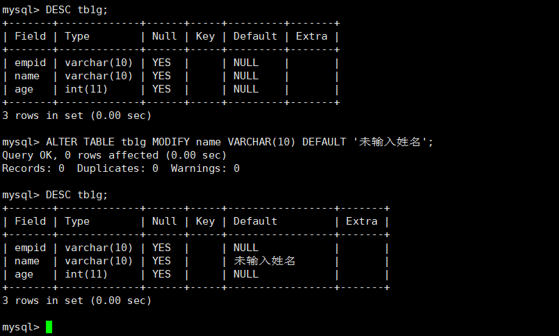 ALTER TABLE 表名 MODIFY 列名 数据类型 DEFAULT ‘未输入姓名’;