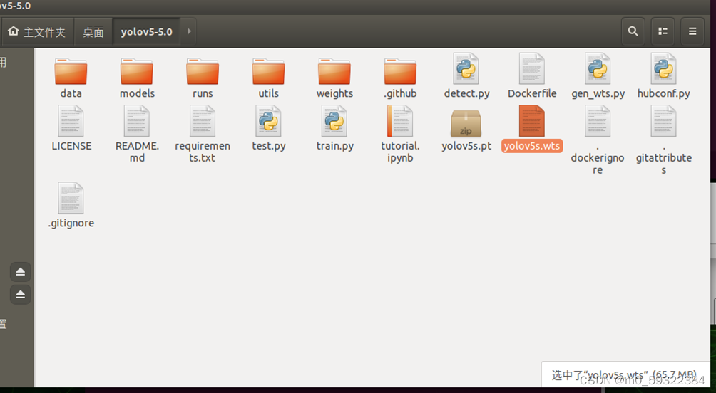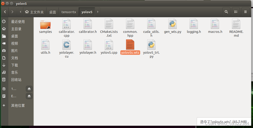 6.打开tensorrtx这个文件夹,将刚刚生成的yolov5s.wts拷贝到yolo v5这个文件夹里。(tensorrtx-yolov5-v5.0\yolov5)