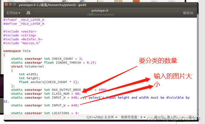 7.在当前路径中找到yololayer.h文件,打开之后可以修改一些参数包括但不限于(类别、数量、图片大小等等)