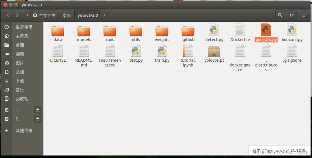 5.在自己的深度学习环境里,也就是第3步的终端对话框里,输入命令 。需要等一会儿。结束后会在yolov5-5.0这个文件夹内多一个yolov5s.wts这个文件。