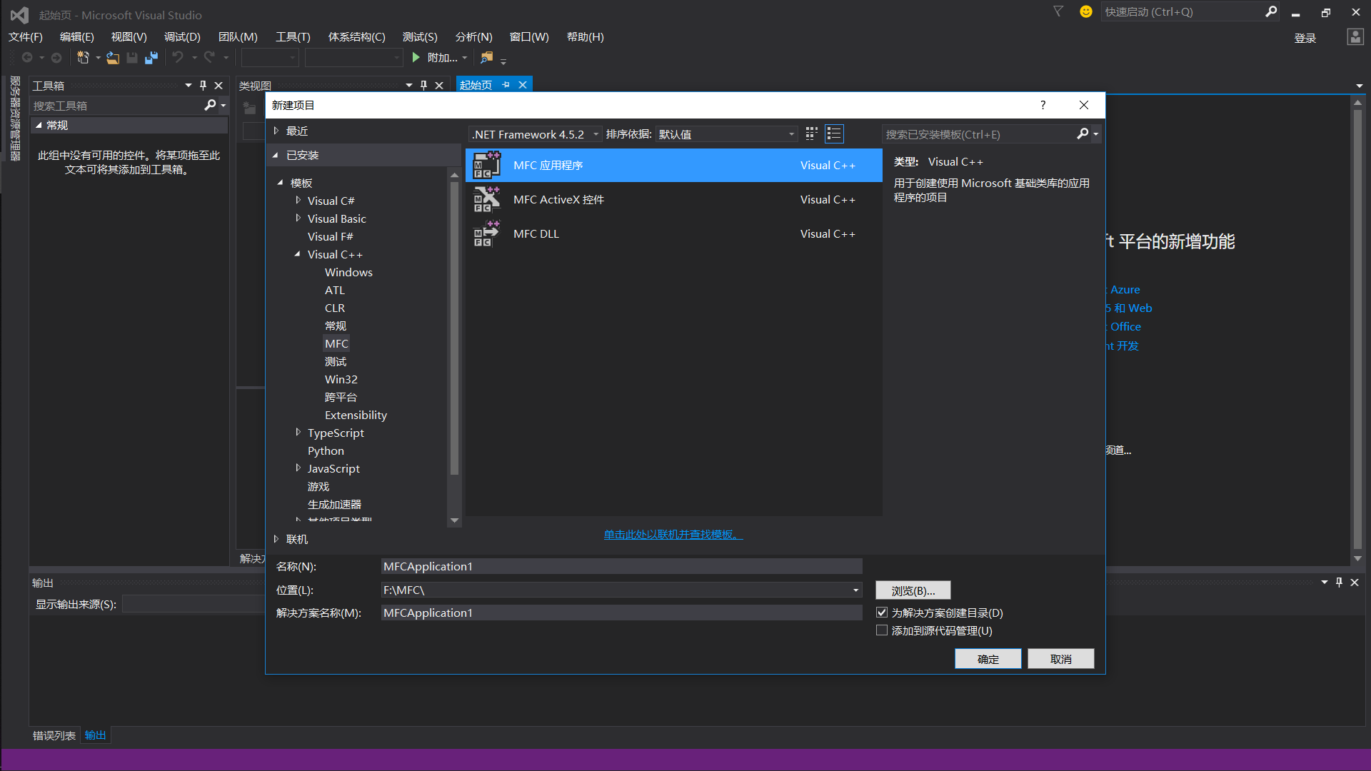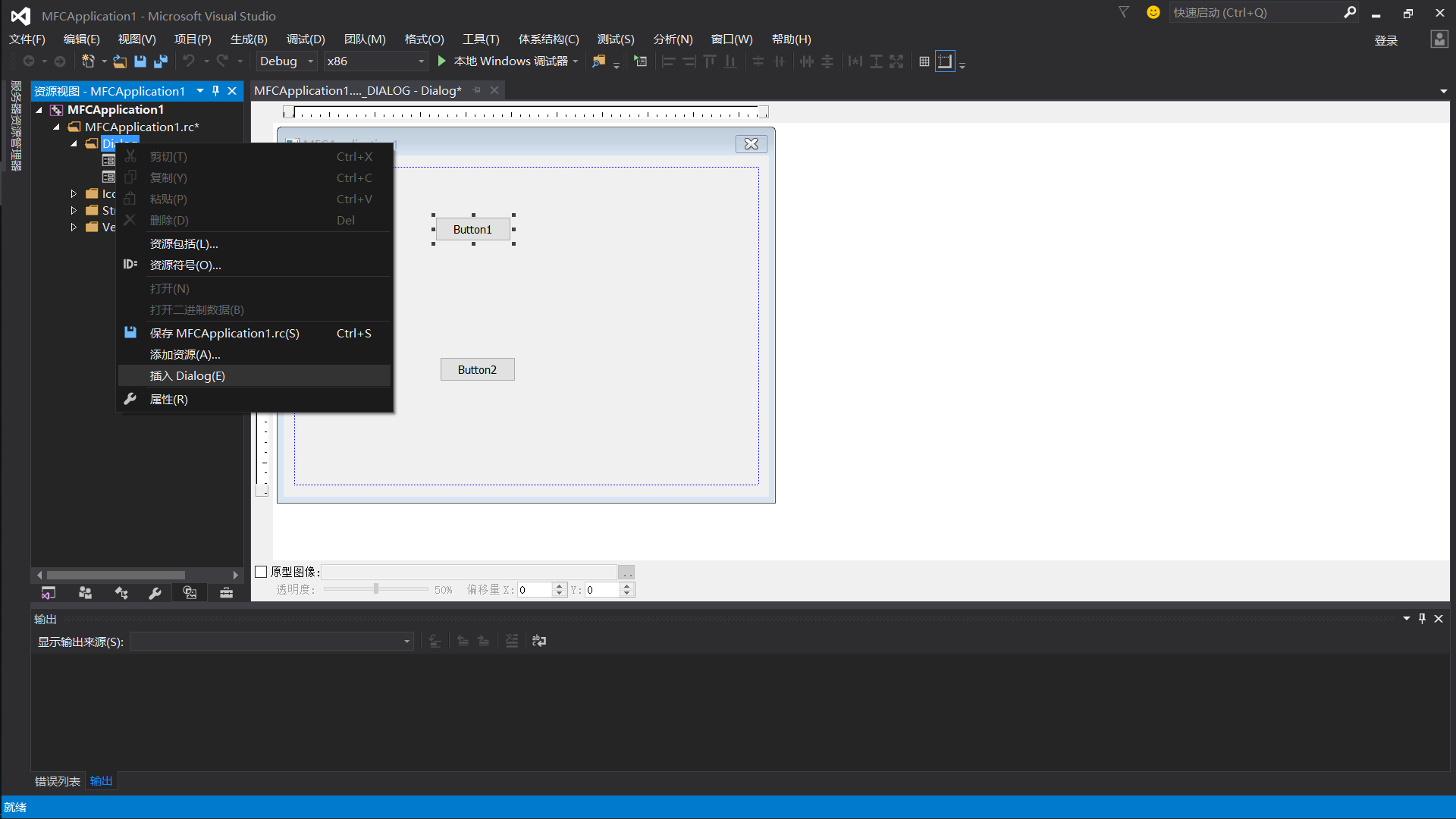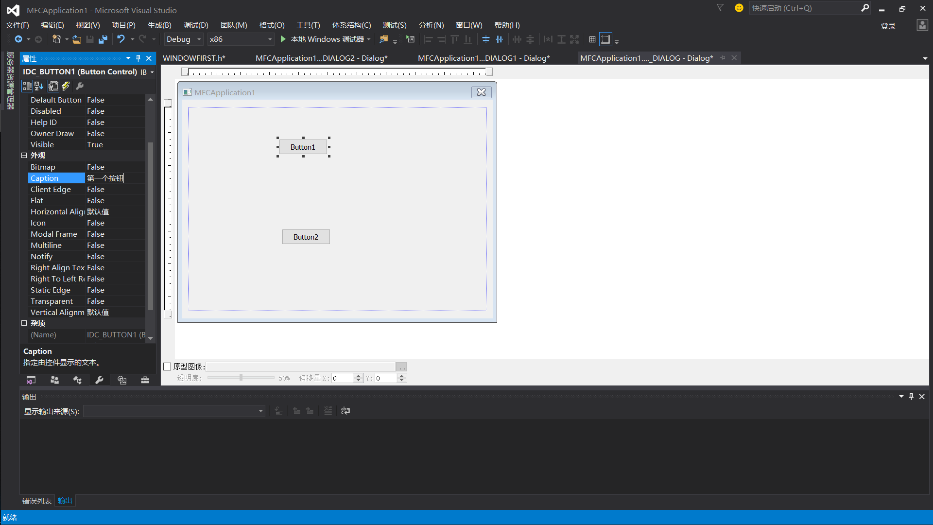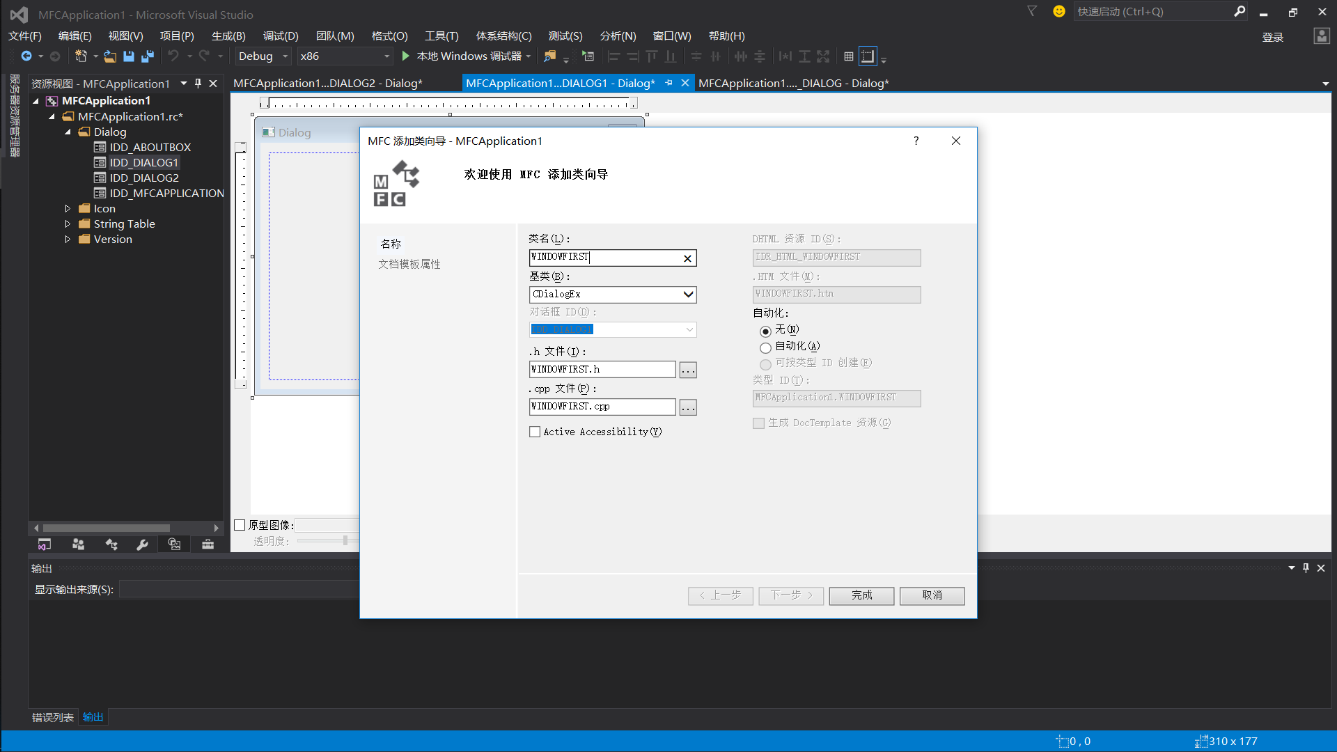5.单击完成,进入到此窗口类的内部文件,不管,打开资源视图,双击最长的ID即主窗口,在其界面上右击属性,点击工具箱添加鼠标两个(右击按钮点击属性在caption那行可以更改名称),分别用来实现模态窗口和非模态窗口