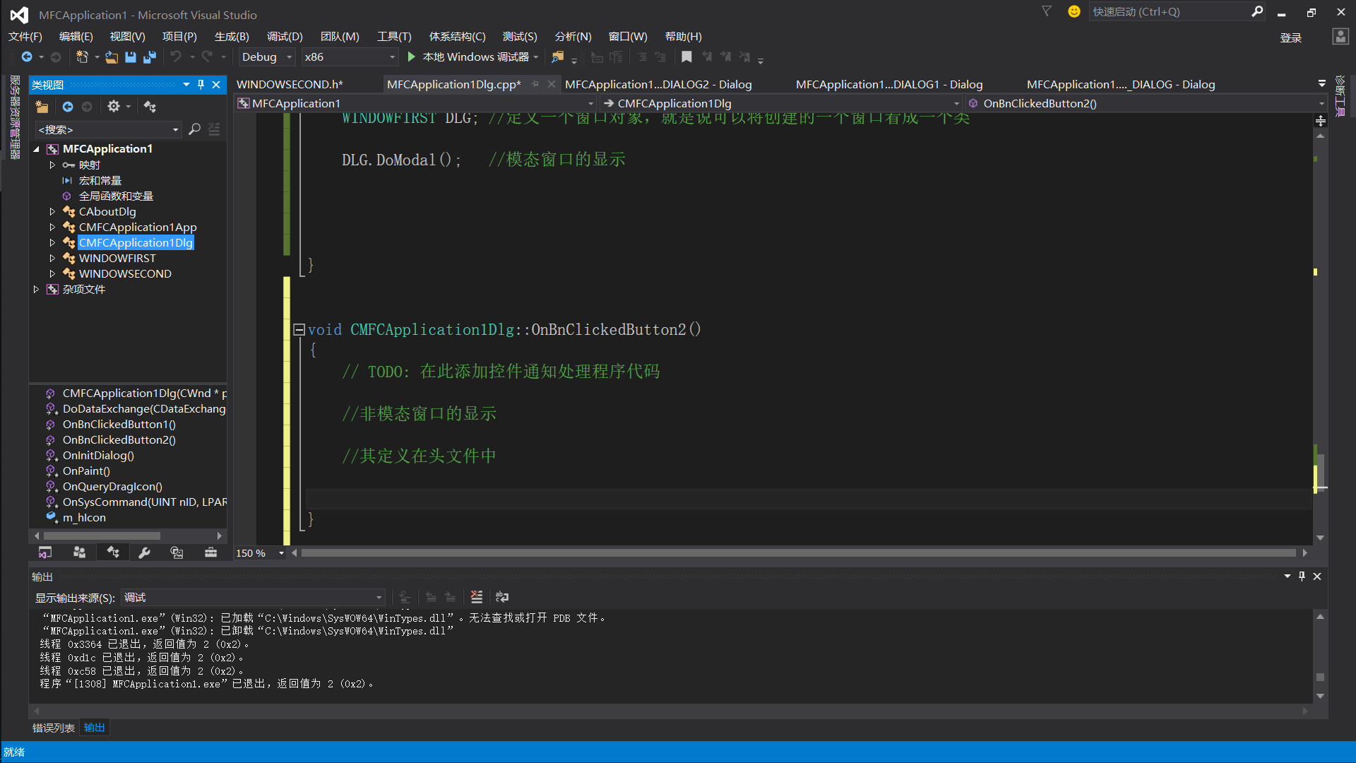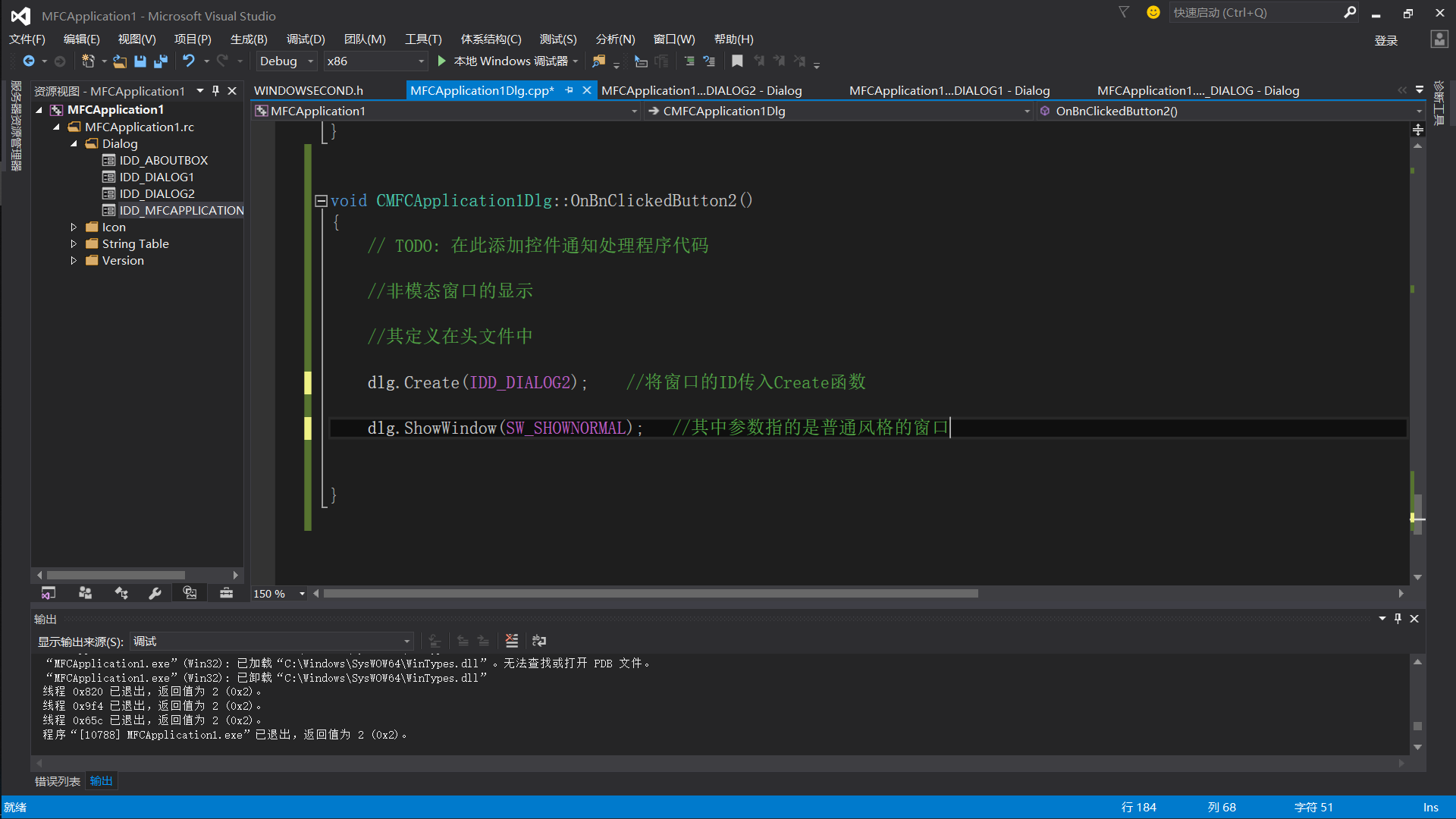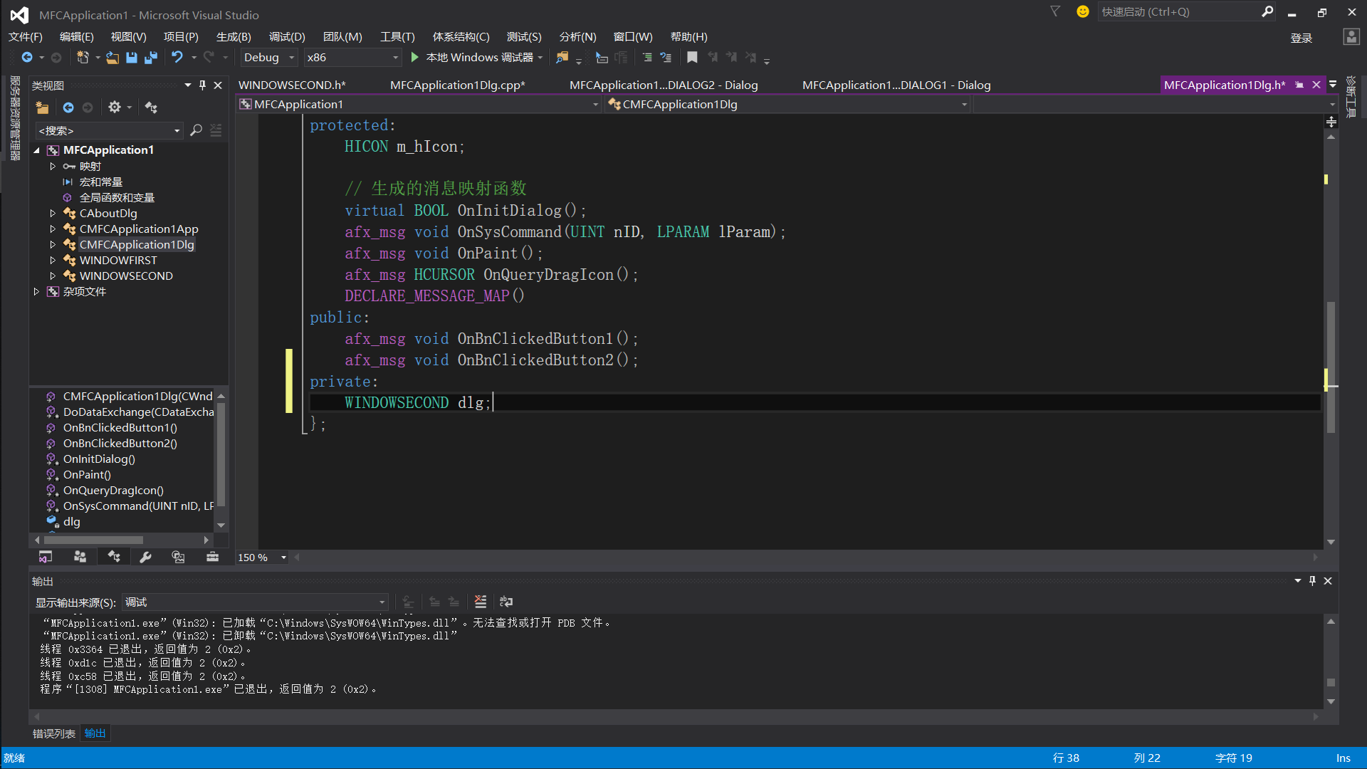 重复刚才建立第一个窗口的步骤,建立第二个窗口,其名为WINDOWSECOND,资源视图会多出IDD_Dialog2,然后再添加一个按钮,双击它,进入消息函数内部(记得添加WINDOWSECOND的头文件):