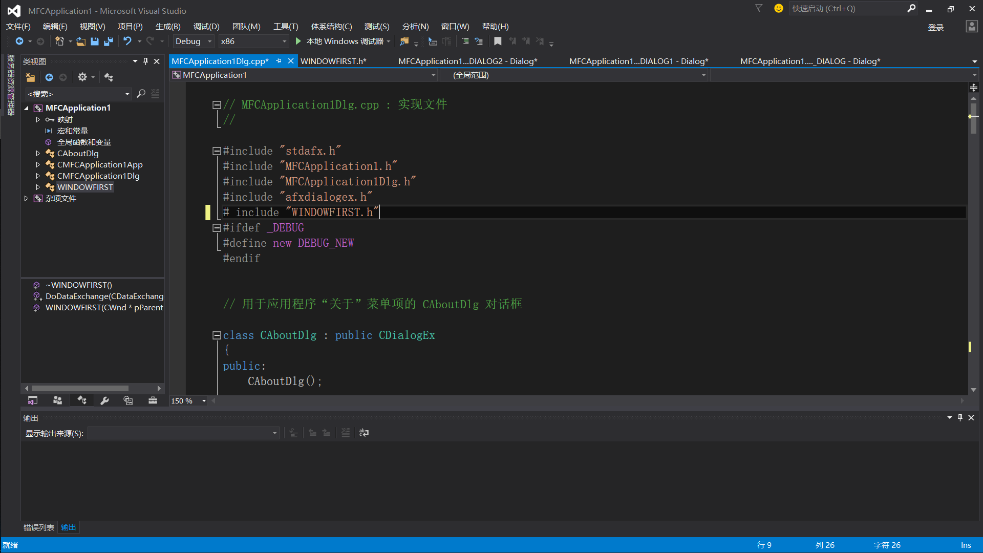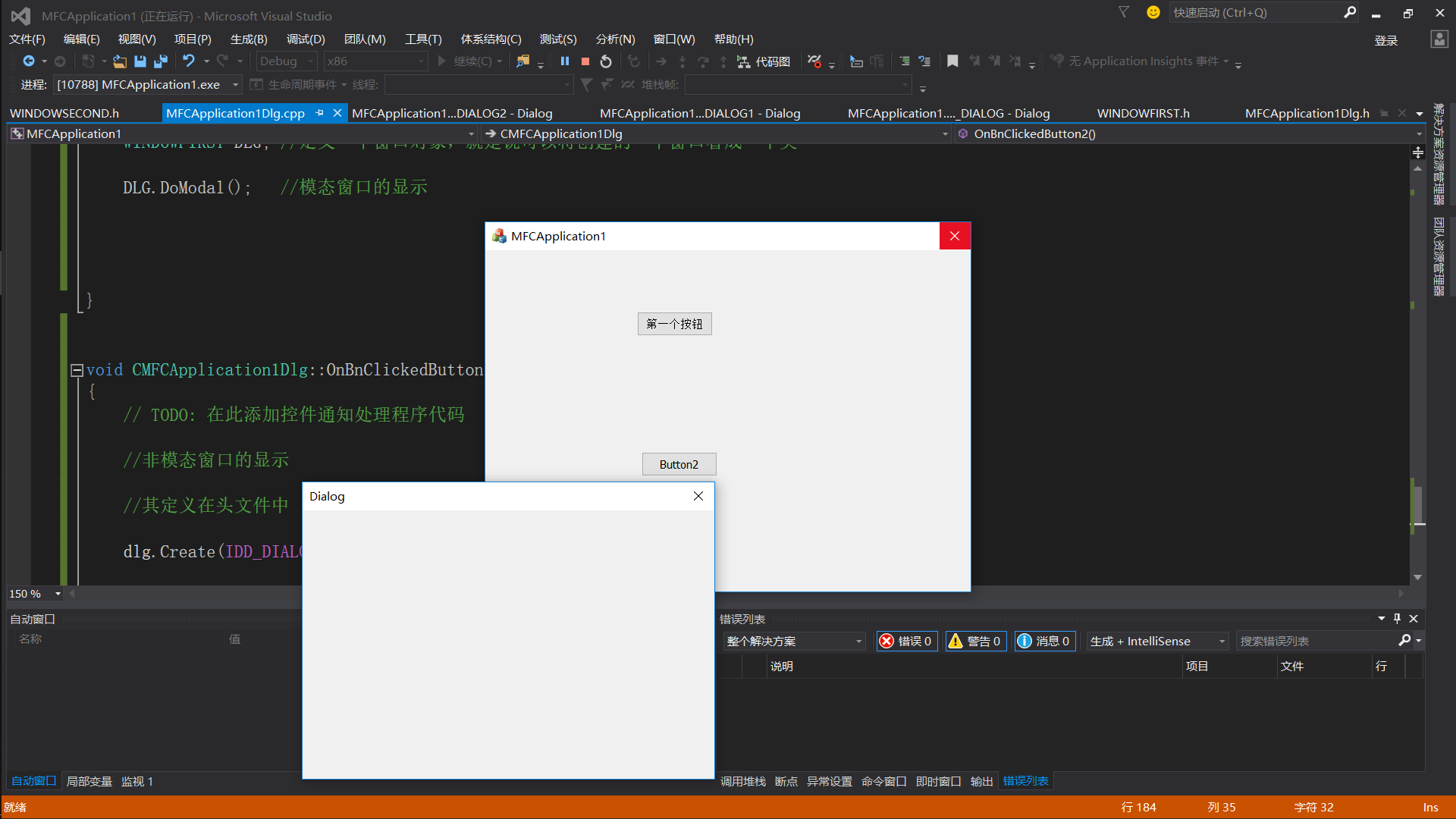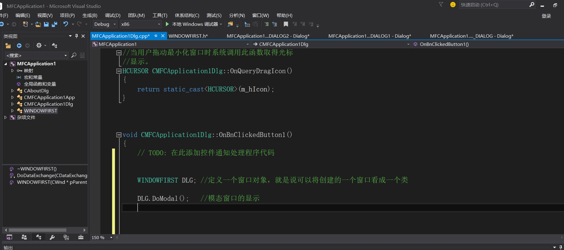 重复刚才建立第一个窗口的步骤,建立第二个窗口,其名为WINDOWSECOND,资源视图会多出IDD_Dialog2,然后再添加一个按钮,双击它,进入消息函数内部(记得添加WINDOWSECOND的头文件):