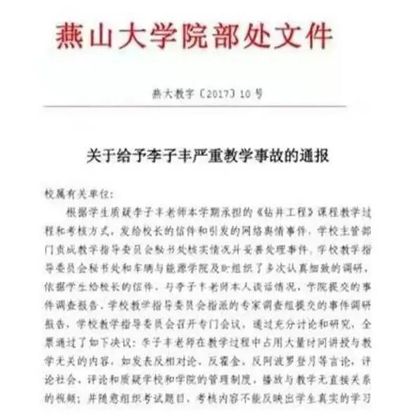 燕山大学院部文件的主要内容为:根据学生质疑李子丰老师本学期承担的《钻井工程》课程教学过程和考核方式,发给校长的信件和引发的网络舆情事件,学校主管部门责任教学指导文员会秘书处核实情况并妥善处理事件……学校教学指导委员会召开专门会议,通过充分讨论,全票通过了如下决议:李子丰老师在教学过程中占用大量时间讲授与教学无关的内容,如发表反相对论、反霍金、反阿波罗登月等言论,评论社会、评论和质疑学校和学院的管理制度,播放与教学无直接关系的视频;并随意组织考试题目,考核内容不能反映出学生真实的学习效果,致使考核结果出现极其不合理的成绩分布,严重影响了教学任务的落实以及教学目标的达成;提出李子丰老师已不适合继续从事本科教学工作,提请学校对事件进一步严肃处理的建议。经研究决定,给予李子丰老师严重教学事故一次并通报批评,并按学校教学指导委员会的建议,3年内停止李子丰老师所有本科教学工作,本学期李子丰老师讲授的《钻井工程》课程考核成绩作废等。