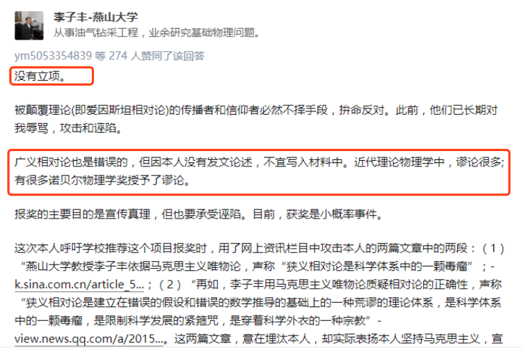 针对此事,记者电话联系了燕山大学教授李子丰。李子丰认为,“国家号召颠覆性创新,所谓颠覆性创新就是颠覆台上的理论,才叫颠覆性创新,否则不叫颠覆性创新,我的理论研究认为现在的理论(爱因斯坦相对论)是错误的。”