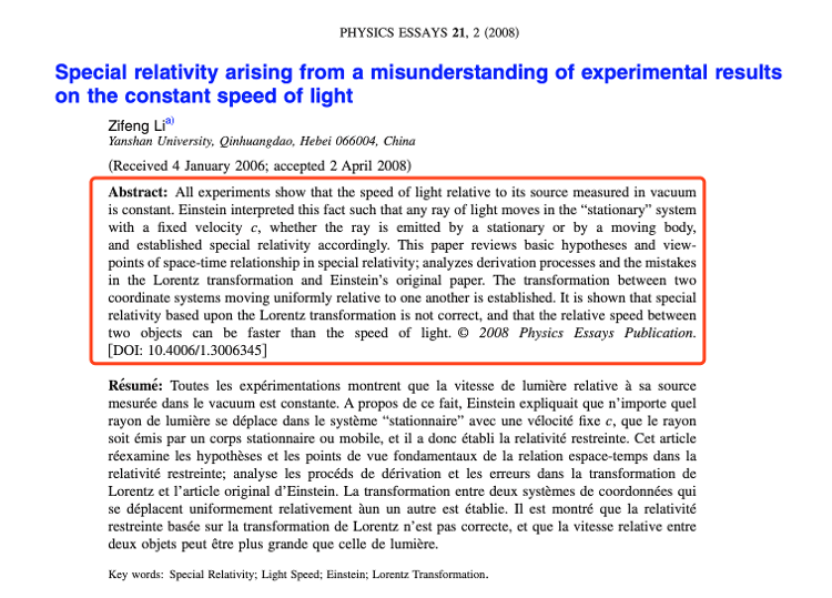 李子丰提供了2008年发布在物理论文(PHYSICS ESSAYS)期刊上的一篇论文,论文摘要中提到,本文回顾了狭义相对论中时空关系的基本假设和观点;分析了洛伦兹变换和爱因斯坦原著的推导过程和错误。建立了相对运动均匀的两个坐标系之间的变换。结果表明,基于洛伦兹变换的狭义相对论是不正确的,两物体之间的相对速度可能比光速快。