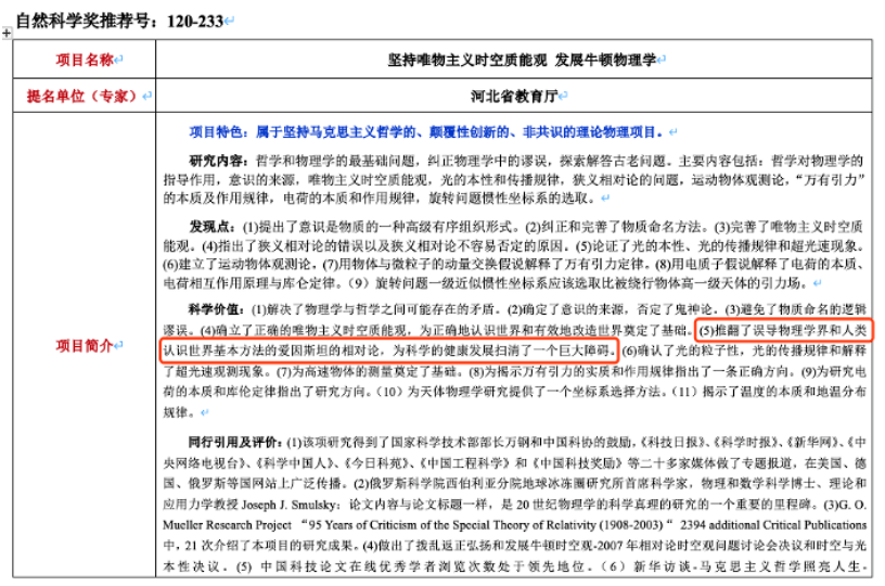 在该项目的推荐项目简介中,研究作者宣称已推翻误导物理学界和人类认识世界基本方法的爱因斯坦的相对论,为科学的健康发展扫清了一个巨大障碍。该项目的自然科学奖推荐号为120-233,推荐单位为河北省教育厅。