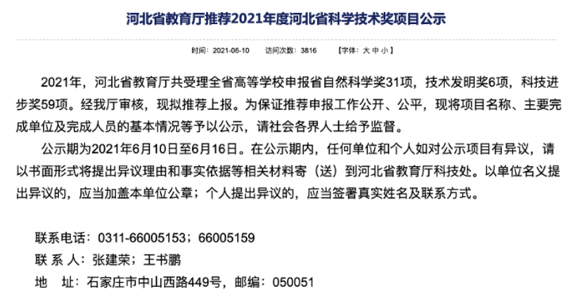 据悉,公示期为2021年6月10日至6月16日。在公示期内,任何单位和个人如对公示项目有异议,需要以书面形式将提出异议理由和事实依据等相关材料寄(送)到河北省教育厅科技处。以单位名义提出异议的,应当加盖本单位公章;个人提出异议的,应当签署真实姓名及联系方式。