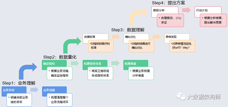 上图是我根据工作经验整理的数据分析4步法,其实跟《诊断学》教学内容非常相似,殊途同归。