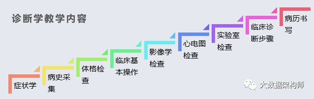 大家可以看看《诊断学》的教学内容,其中有症状学、病史采集、各种检查、临床诊断步骤和病历书写。