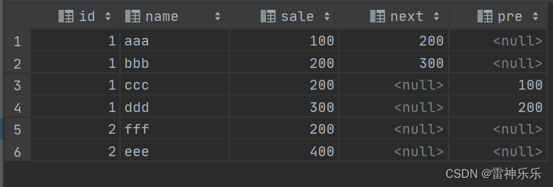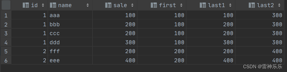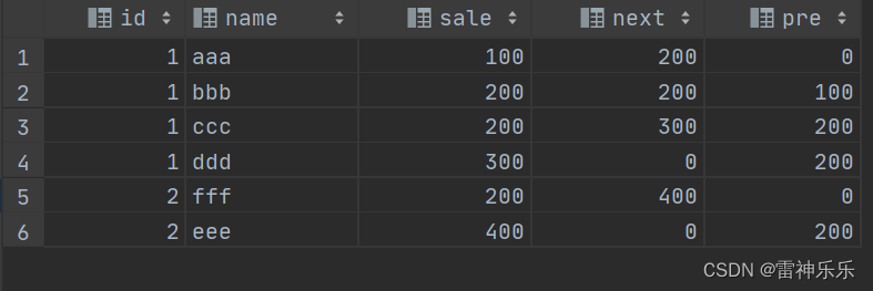 是按照id分组,sale升序排序,lead()取sale的前一位,如果没有前一位,默认是0;lag()取sale得后一位,如果没有后一位,默认是0。