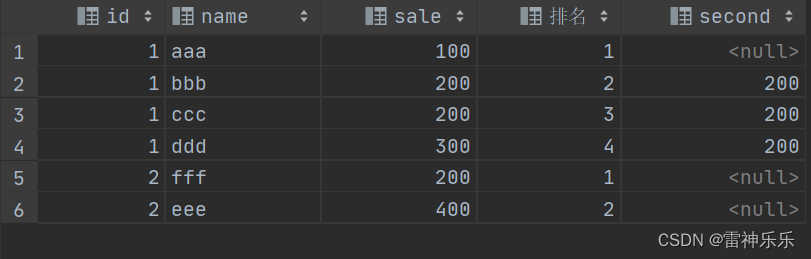 示例1:按照id分组进行sale字段的排名,并且取sale排名的第2个