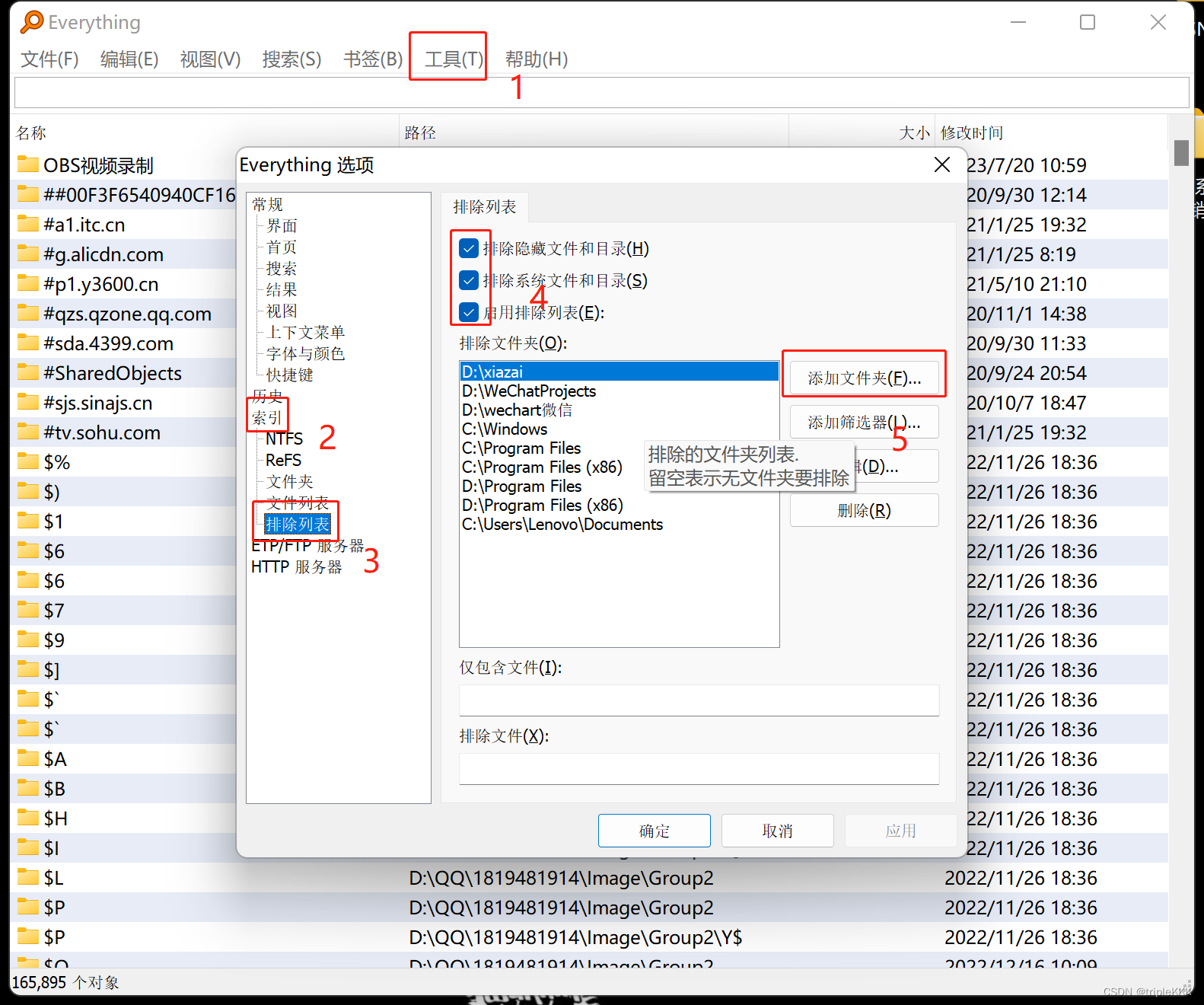 打开后,初次使用everything软件时候,搜索中会出现大量C盘下的文件,或者其他临时文件,这些搜索结果并不是我们真正想要的,就需要点击工具->选项->索引->排除列表->排除文件夹,在其中添加我们需要排除的。