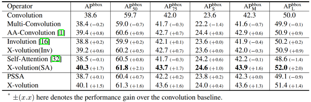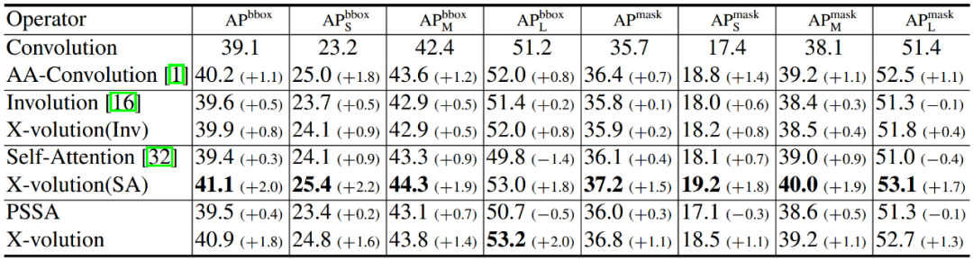 作者进一步在更复杂的目标检测和实例分割上验证所提出的算子的有效性。他们的实验模型是用 X-volution 增强的 ResNet-50,具体是替换了 ResNet-50 最后一个阶段的三个瓶颈单元。为了充分的对比,作者展示了两种形态的 X-volution,如表 2 和表 3 所示:X-volution(SA) 表示的是卷积与 global self-attention 结合,这种形态是为了验证 X-volution 采用的卷积和 self-attention 结合模式的可行性;X-volution 则表示卷积和 PSSA 直接结合的形式,其为了检验所提出的 PSSA 的可行性。