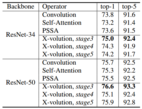 从表 2 与表 3 可以看出,两种 X-volution 模式都获得了大幅度的性能提升。其中,X-volution(SA) 更为明显,这说明卷积和 self-attention 的互补对性能提升具有重大意义。而采用 PSSA 的 X-volution 性能也非常不俗,基本与 self-attention 性能相当,这也验证了采用 PSSA 逼近 self-attention 是有效且合理的。