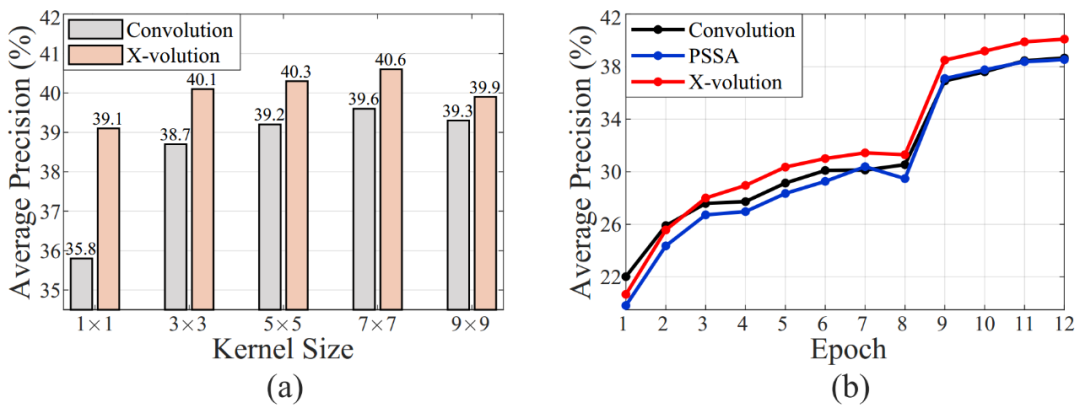 在图 2(b) 中,研究者展示了卷积、PSSA 和 X-volution 三种算子在 MS COCO 目标检测上的收敛曲线。可以看到,卷积在最开始时性能优于 X-volution 和 PSSA;而经过 3 个周期训练后,X-volution 开始超越卷积,但是作为self-attention的逼近形式,PSSA在前9个周期收敛性能稍弱于卷积。其后,X-volution 一直保持显著的领先。PSSA 则在 10 个周期后与卷积相当或略好于卷积。这组曲线证实了卷积的局部归纳偏置对于其训练是有明显的帮助,而低偏置的 self-attention 则收敛显著慢于卷积,但经过较长时间训练后可以超越卷积。将两者整合的 X-volution 则兼备了卷积和 self-attention 的特性,同时展现了优秀的优化特性和良好的性能。