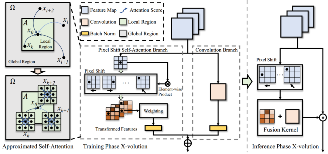 更重要的是,这个多分枝的结构可以利用结构重参数化的方法进行有条件的合并。多分枝结构可以合并为单个卷积,合并后可以获得一个原子级的算子,称为 X-volution(X-volution 的权重可以看作一个静态卷积权重,以及一个内容相关动态卷积权重的和)。此算子同时具备了卷积和 self-attention 的特性,且不会影响网络的规范性 / 可用性。