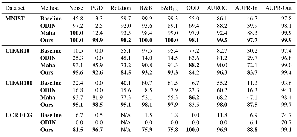 如下表所示,在 ,,, 中对于不同 OOD 数据和对抗攻击中所有数值的真实阳性率为 95%。可以发现,论文中所提出的 GGA 方法对所有攻击都表现出较高的识别性能。