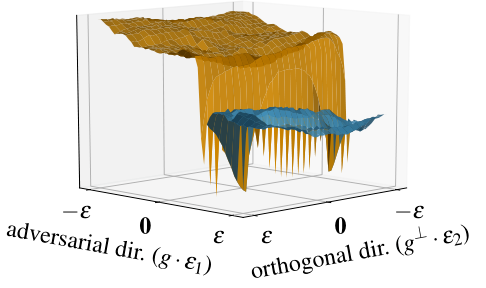 如下图所示,分类器的预测标签是彩色编码的,其中橙色的部分对应于真实类别,而蓝色的部分对应于对抗攻击后预测的类别。在决策边界附近,当不同类别的 之间的梯度方向开始发散时, 会发生特征波动。由此可以看出, 的平均值是分类器决策的稳定指标。