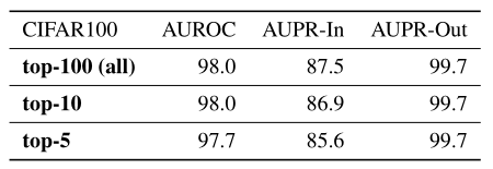 如下表所示为使用的相同的对抗攻击和异常数据的检测性能,这些数据仅使用前 个预测进行计算。可以发现即使只有5%的原始 用于计算 ,所有检测任务的性能也仅略微下降。可以观察到预测类别和非预测类别的梯度之间的余弦相似性对于检测不可信的预测来说是足够的。
