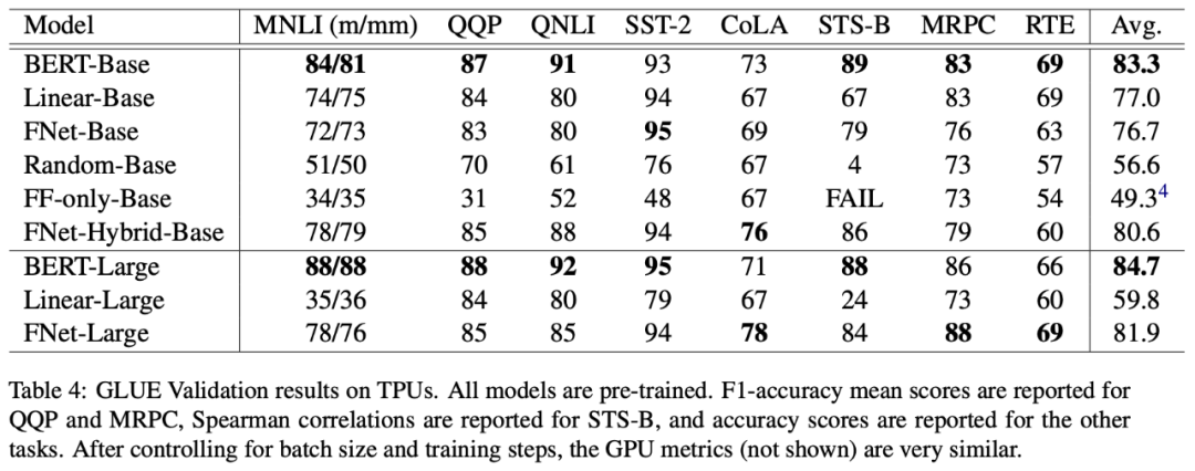 FNet 的部分效果如下表。其实从预训练和下游任务的效果上来看,FNet 并没有什么优势,不过它在 Long-Range Arena [4](一个测试模型长程能力的评测榜单)上的效果倒是不错。