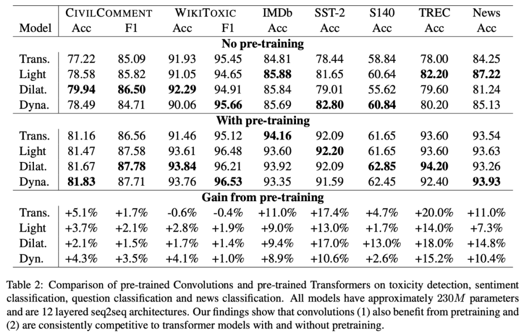 论文《Are Pre-trained Convolutions Better than Pre-trained Transformers?》则帮助我们验证了“CNN+预训练”的有效性。论文结果显示,不管是直接用下游数据监督训练,还是先预训练然后微调,基于膨胀卷积或动态卷积的 CNN 模型都略优于 Transformer 模型,并且在速度上 CNN 模型还更加快。对了,这篇论文已经中了 ACL 2021,所以这篇论文的成文其实更早,只不过这个月才放出来而已。