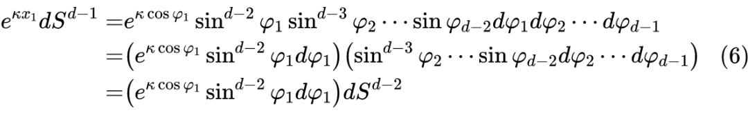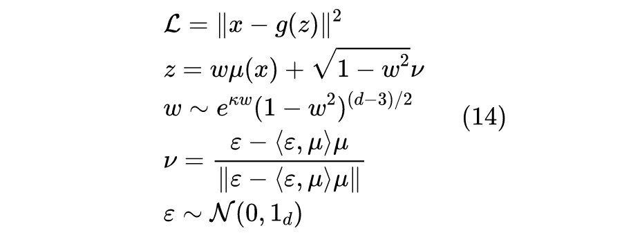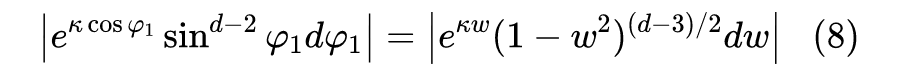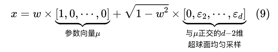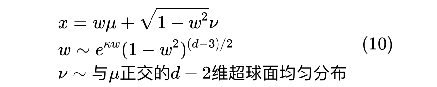 这个分解表明,从该 vMF 分布中采样,等价于先从概率密度正比于 的分布采样一个 ,然后从 d-2 维超球面上均匀采样一个 d-1 维向量 ,通过如下方式组合成最终采样结果: