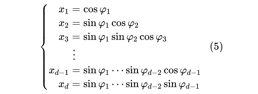 最简单是 的情形,也就是 d-1 维球面上的均匀分布,因为标准正态分布本来就是各向同性的,其概率密度正比于 只依赖于模长,所以我们只需要从 d 为标准正态分布中采样一个 z,然后让 就得到了球面上的均匀采样结果。