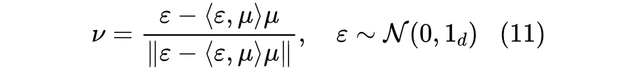 对于 v 的采样,关键之处是与 正交,这也不难实现,先从标准正态分布中采样一个 d 维向量 z,然后保留与 正交的分量并归一化即可: