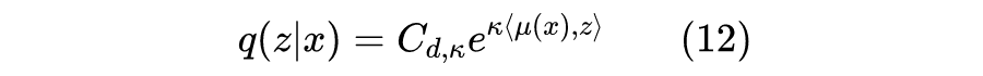 至此,我们可谓是已经完成了本篇文章最艰难的部分,剩下的构建 vMF-VAE 可谓是水到渠成了。vMF-VAE 选用球面上的均匀分布()作为先验分布 ,并将后验分布选取为 vMF 分布: