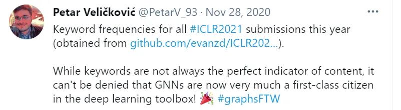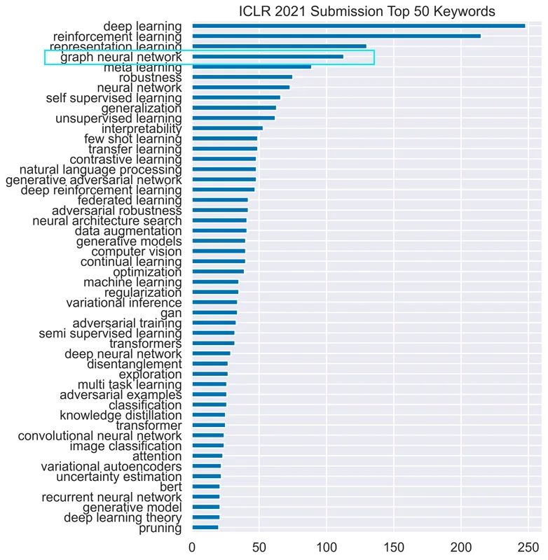 深度学习领域的顶级大会(International Conference on Learning Representations),在几个月前,有人分析了提交给该大会的论文中的高频词,发现图神经网络(GNN)赫然排在第4位,仅次于「深度学习」「强化学习」和「表征学习」。