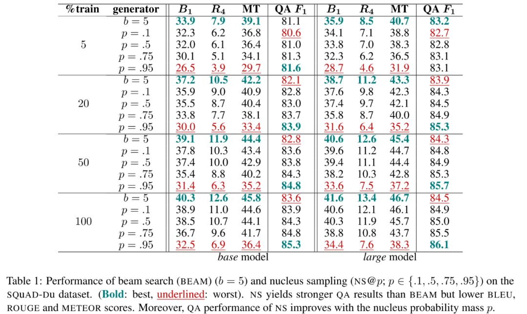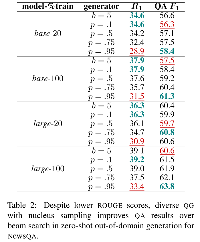 为了测试 QG 模型的域外泛化能力,作者用上面在 SQuAD 训练集上训练的 QG 模型为 NewsQA 训练集生成问题,然后训练对应的 QA 模型并测试,测试结果进一步支持了上述结论,也就是随着核采样 值的增大,多样性越大,BLEU、ROUGE 分数越低,QA 越高。