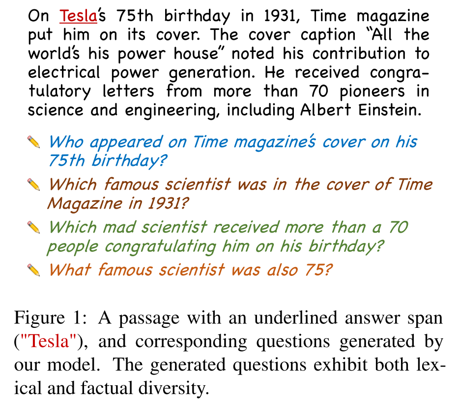下面是作者构建的基于 RoBERTa+UniLM 的问题生成模型,可以看出,生成的问题不但在词汇层面上具有多样性,在语义层面上也具有多样性,也就是提出的问题在针对答案实体的疑问方面上均有所不同,甚至引入了上下文没包含的世界知识(原文没有提到 Tesla 有 mad scientist 的名声)。