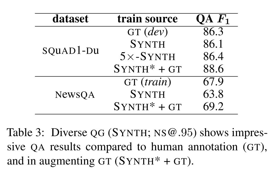 如下表所示,可以发现在 SQuAD 数据集上,用生成的问题(SYNTH)和人类标注的问题(GT)训练的 QA 模型的表现非常接近(86.1 vs. 86.3),当为每个答案生成5个问题时,QA 超越了 GT (86.4 vs. 86.3),这很大程度上是由多样性带来的增益。