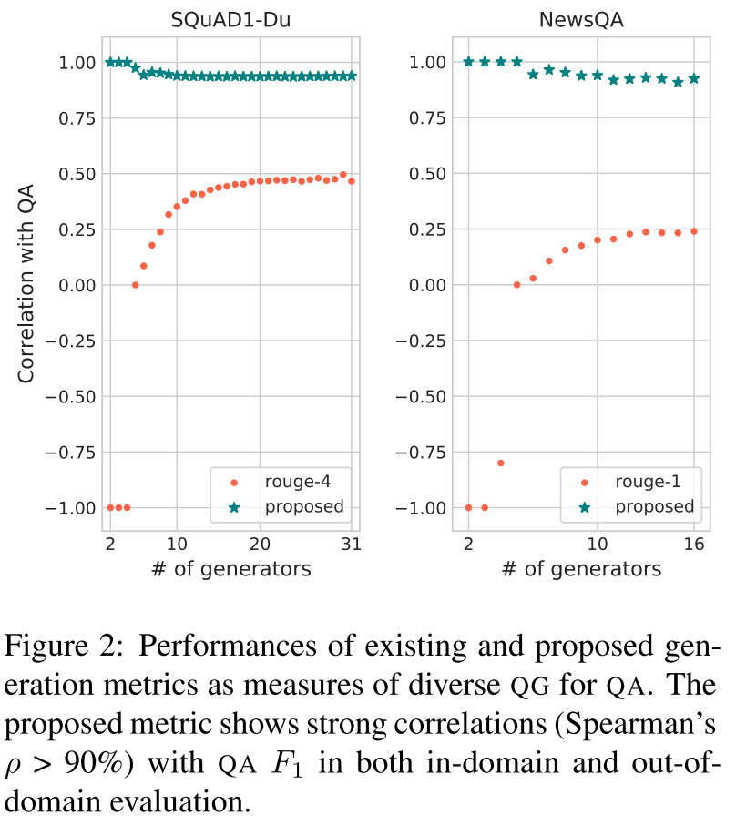 同时,作者发现目前广泛使用的评估指标(BLEU、ROUGE、METEOR)不能准确衡量 QG 模型实际的生成质量,因此作者进一步提出了一种能够综合评估 QG 模型综合性能的指标,该指标综合考虑了 QG 的准确性和多样性,并且与下游 QA 模型的性能指标高度正相关。