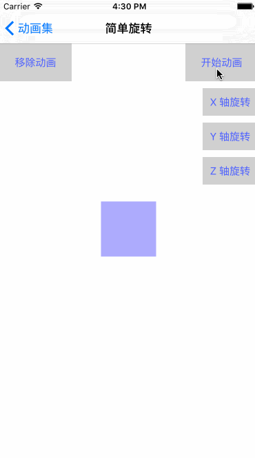 };@interface WBRotatingVC ()@end@implementation WBRotatingVC- (void)viewDidLoad {[super viewDidLoad];UIButton *axisX = [UIButton buttonWithType:UIButtonTypeCustom];axisX.titleLabel.font = [UIFont systemFontOfSize:15];[axisX setTitle:@"X 轴旋转" forState:UIControlStateNormal];[axisX setTitleColor:[UIColor colorWithRed:0.307 green:0.397 blue:1.000 alpha:1.000] forState:UIControlStateNormal];[axisX setBackgroundColor:[UIColor colorWithWhite:0.814 alpha:1.000]];[axisX addTarget:self action:@selector(rotatingWithAxisX:) forControlEvents:UIControlEventTouchUpInside];UIButton *axisY = [UIButton buttonWithType:UIButtonTypeCustom];axisY.titleLabel.font = [UIFont systemFontOfSize:15];[axisY setTitle:@"Y 轴旋转" forState:UIControlStateNormal];[axisY setTitleColor:[UIColor colorWithRed:0.307 green:0.397 blue:1.000 alpha:1.000] forState:UIControlStateNormal];[axisY setBackgroundColor:[UIColor colorWithWhite:0.814 alpha:1.000]];[axisY addTarget:self action:@selector(rotatingWithAxisY:) forControlEvents:UIControlEventTouchUpInside];UIButton *axisZ = [UIButton buttonWithType:UIButtonTypeCustom];axisZ.titleLabel.font = [UIFont systemFontOfSize:15];[axisZ setTitle:@"Z 轴旋转" forState:UIControlStateNormal];[axisZ setTitleColor:[UIColor colorWithRed:0.307 green:0.397 blue:1.000 alpha:1.000] forState:UIControlStateNormal];[axisZ setBackgroundColor:[UIColor colorWithWhite:0.814 alpha:1.000]];[axisZ addTarget:self action:@selector(rotatingWithAxisZ:) forControlEvents:UIControlEventTouchUpInside];[self.view addSubview:axisX];[self.view addSubview:axisY];[self.view addSubview:axisZ];[axisX mas_makeConstraints:^(MASConstraintMaker *make) {make.trailing.equalTo(@0);make.top.equalTo(@129);make.width.equalTo(@80);make.height.equalTo(@40);}];[axisY mas_makeConstraints:^(MASConstraintMaker *make) {make.trailing.equalTo(@0);make.top.equalTo(axisX.mas_bottom).offset(10);make.width.equalTo(@80);make.height.equalTo(@40);}];[axisZ mas_makeConstraints:^(MASConstraintMaker *make) {make.trailing.equalTo(@0);make.top.equalTo(axisY.mas_bottom).offset(10);make.width.equalTo(@80);make.height.equalTo(@40);}];