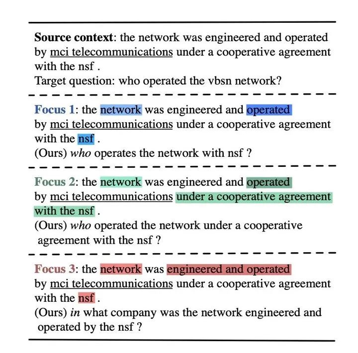 这篇论文是华为诺亚方舟收录在 EMNLP 2020 的工作。主要关注的是 QA 工作的逆任务,基于回复和上下文来生成问题,同样这也在一对多生成的范畴内。本文主要思想是通过关注 context 中的不同位置以及表达的不同含义来建模多样性。