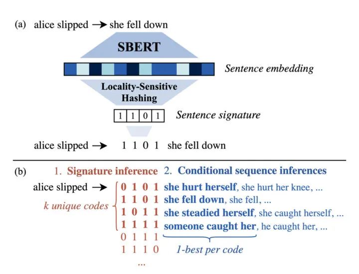 该模型主要是用 sentence-BERT (SBERT) 获得的上下文相关语义表示,通过使用 Locality-Sensitive Hashing (LSH) 来获得句子的离散语义代码。然后采用两阶段的解码策略,获得最相关的代码,作为前缀,使用 prefix-conditioned beam search 方法进行解码。