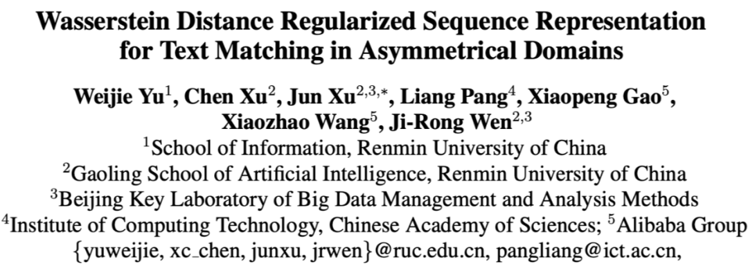 在本文中,作者提出了一种新颖的基于 Wasserstein 距离的正则化项来改进序列表示,以用于非对称域中的文本匹配。该方法称为 WD-Match,根据给定的投影特征估计 Wasserstein 距离,并最小化 Wasserstein 距离的正则匹配损失。