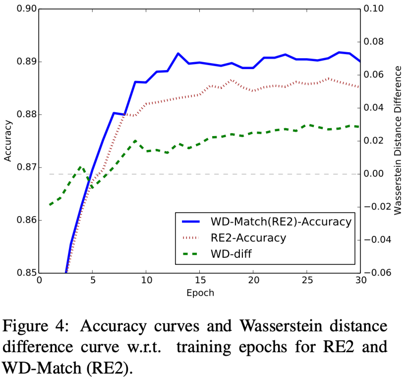 进一步,作者研究了 RE2 模型训练过程的变化,发现添加了该模块后,的确随着轮数的增加优化了 Wasserstein 距离,进一步证明了模型的有效性。