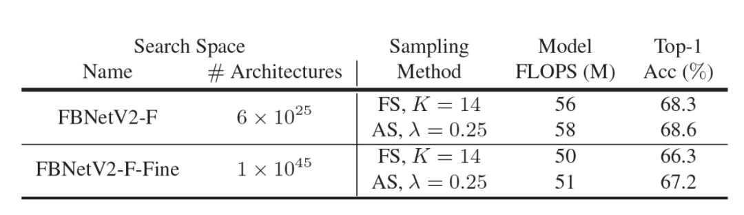 FBNetV2-F space。这是先前 FBNetV2 工作中提出的一个空间,一共包含6×10^25个不同的架构。
