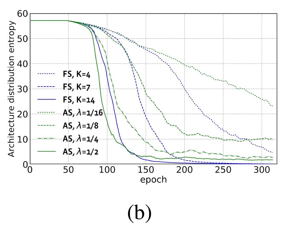 这里, Η表示分布熵, λ是一个预定义的系数。自适应采样在搜索前期因为熵较高而采样更多的架构。但是因为在搜索后期分布熵大大降低,我们只需要采样少量架构就能获得很好的搜索结果。