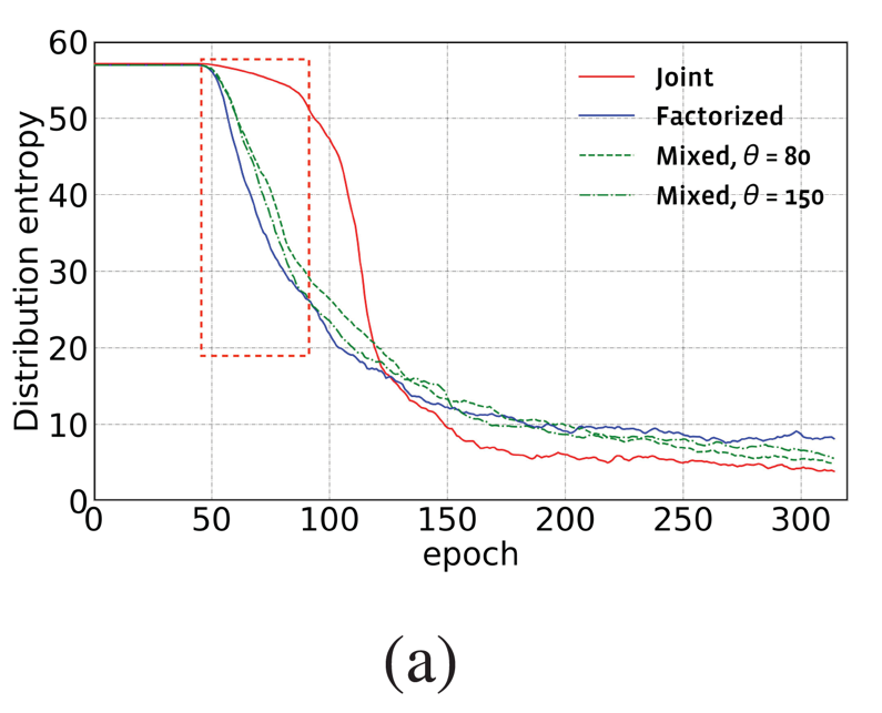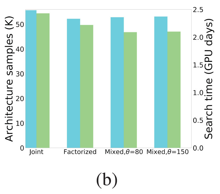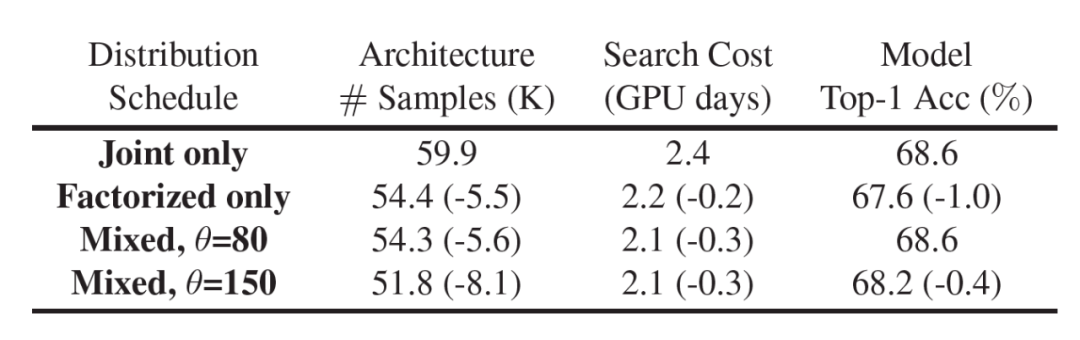 在图 4 中,我们比较联合概率分布 (JD) 和分解概率分布(FD)。在搜索前期迭代 80 次时,架构分布概率熵有很大不同(54.4 Vs 30.6)。但是在搜索后期,分解概率分布降低架构分布概率熵的速度却较慢,并不能精确地区分一小部分高概率的架构。因此,我们提出混合架构分布概率调度(MD)。在搜索开始采用分解概率分布,然后在迭代θ次的时候,将其无缝转换到联合概率分布。在图 4(a)中,我们呈现了采用不同